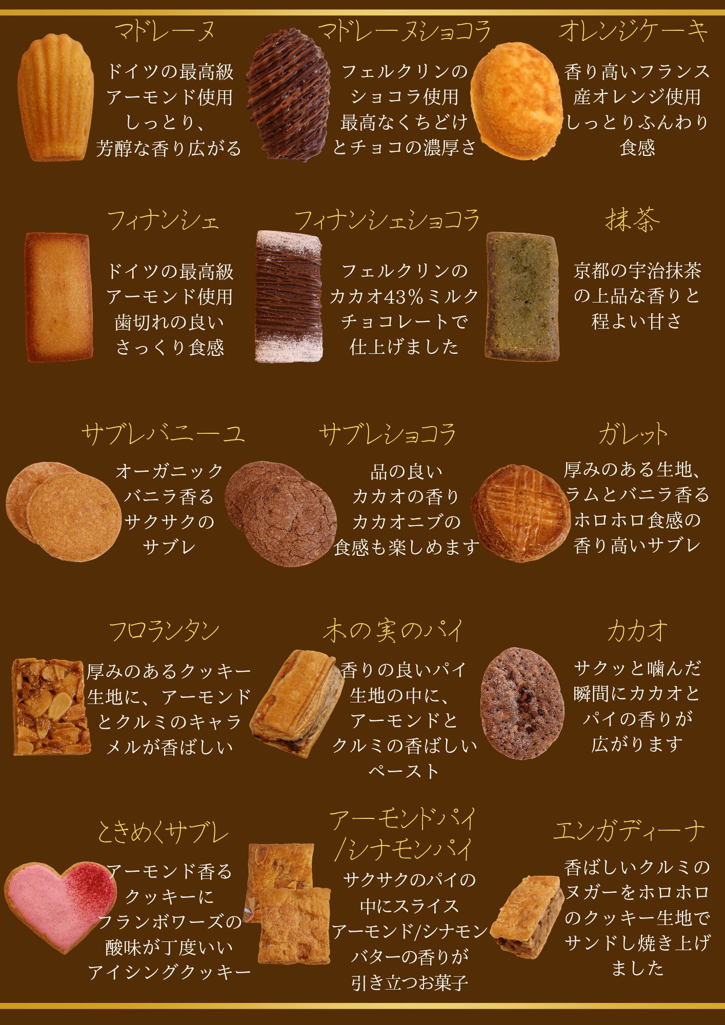 ●内容:サブレバニーユ二枚入り・サブレショコラ二枚入り・オレンジケーキ・フィナンシェ・フィナンシェショコラ・抹茶フィナンシェ・マドレーヌ・マドレーヌショコラ・ガレット・カカオ・フロランタン・木の実のパイ・丹波の黒豆と栗パウンド